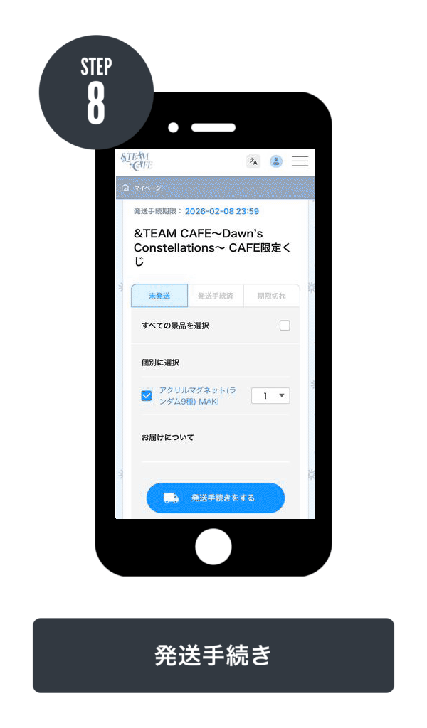 くじご購入後、マイページの「当選商品の確認・発送手続き」ボタンから、発送手続きを行ってください。